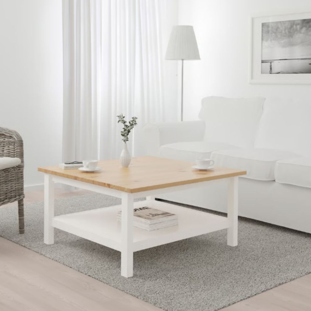 - Tabla: Pino macizo, Barniz acrílico incoloro. Pata: Pino macizo, Barniz acrílico incoloro, Tinte blanco/café claro. Tamaño: 90x90 cm.